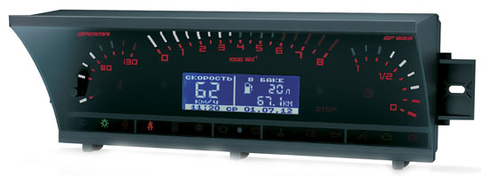 Комбинация приборов Гамма GF 683 предназначена для установки на место "высокой" панели автомобилей ВАЗ 2109, 21093. Важно, что эта приборная панель обладает повышенной информативностью - на нее выводятся маршрутные и диагностические параметры. Другими словами комбинация представляет собой полноценный бортовой компьютер с функцией диагностики. Панель приборов GF 683 выводит на дисплей множество данных, к которым относятся коды неисправностей, мгновенный расход топлива и т. п. Отметим, что совместное использование этой комбинации и бортового компьютера невозможно, так как к-линия может быть соединена только с одним прибором. Управление панелью осуществляется при помощи энкодера (поворотной кнопки - переключателя).